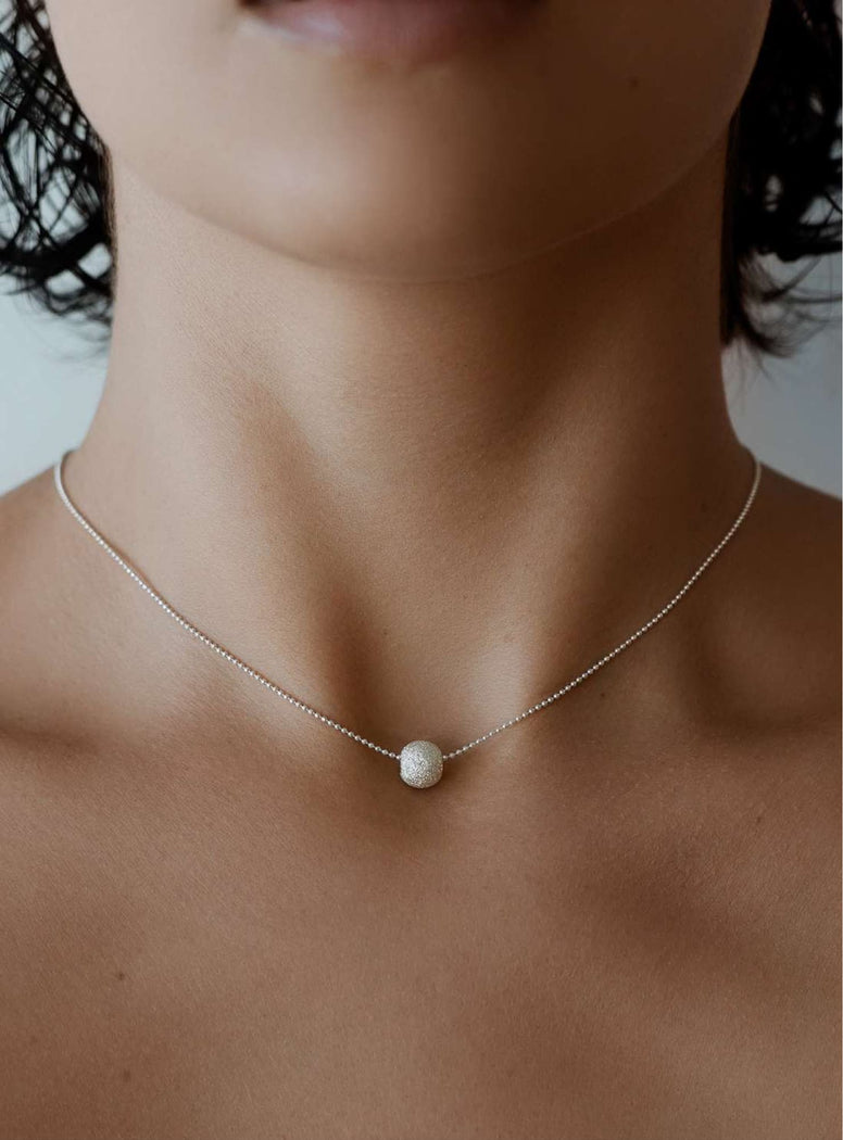 Sterling silver ball pendant on a ball chain. The reflective surface dances with light for a star like shimmer and timeless elegance.